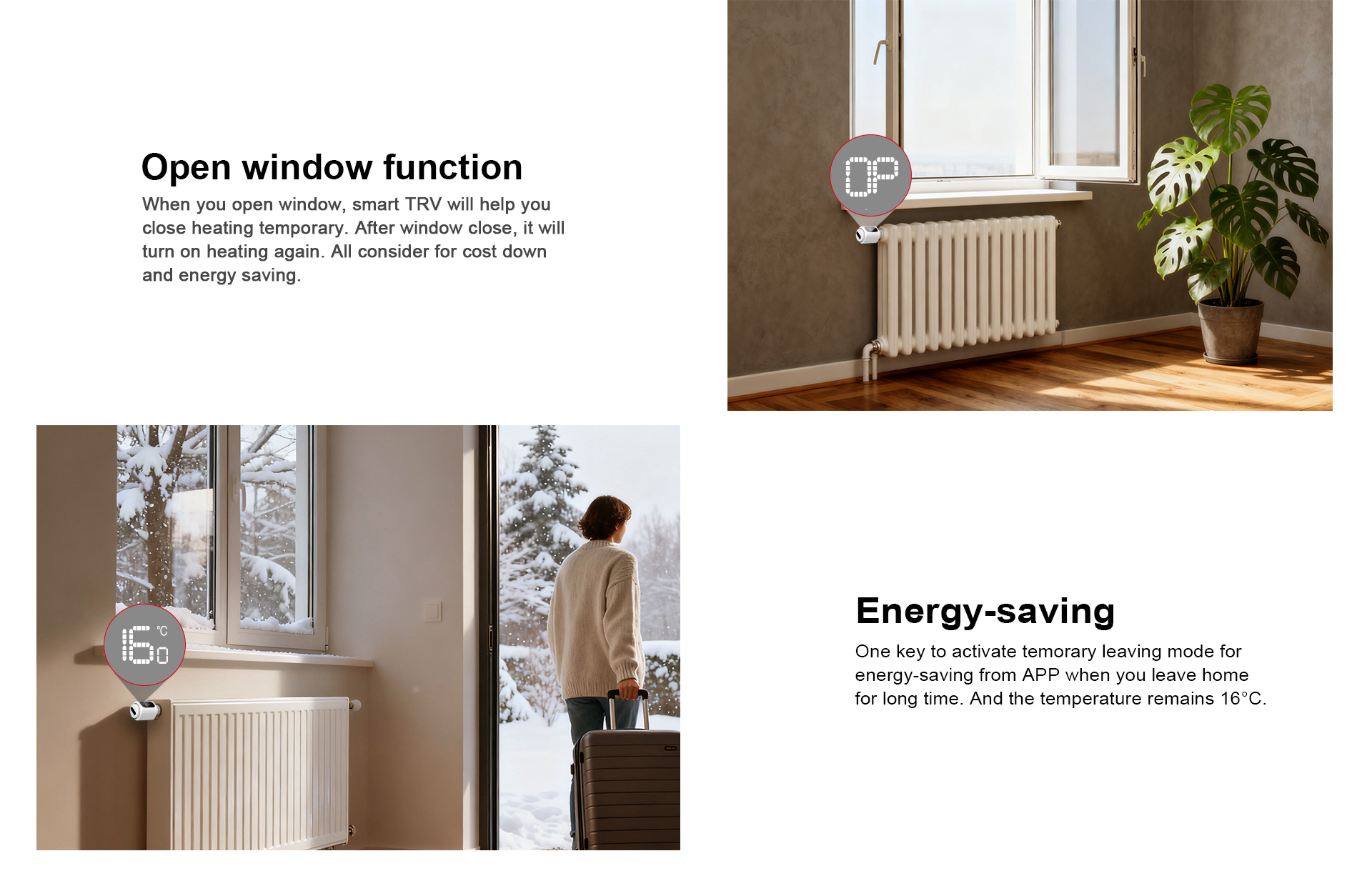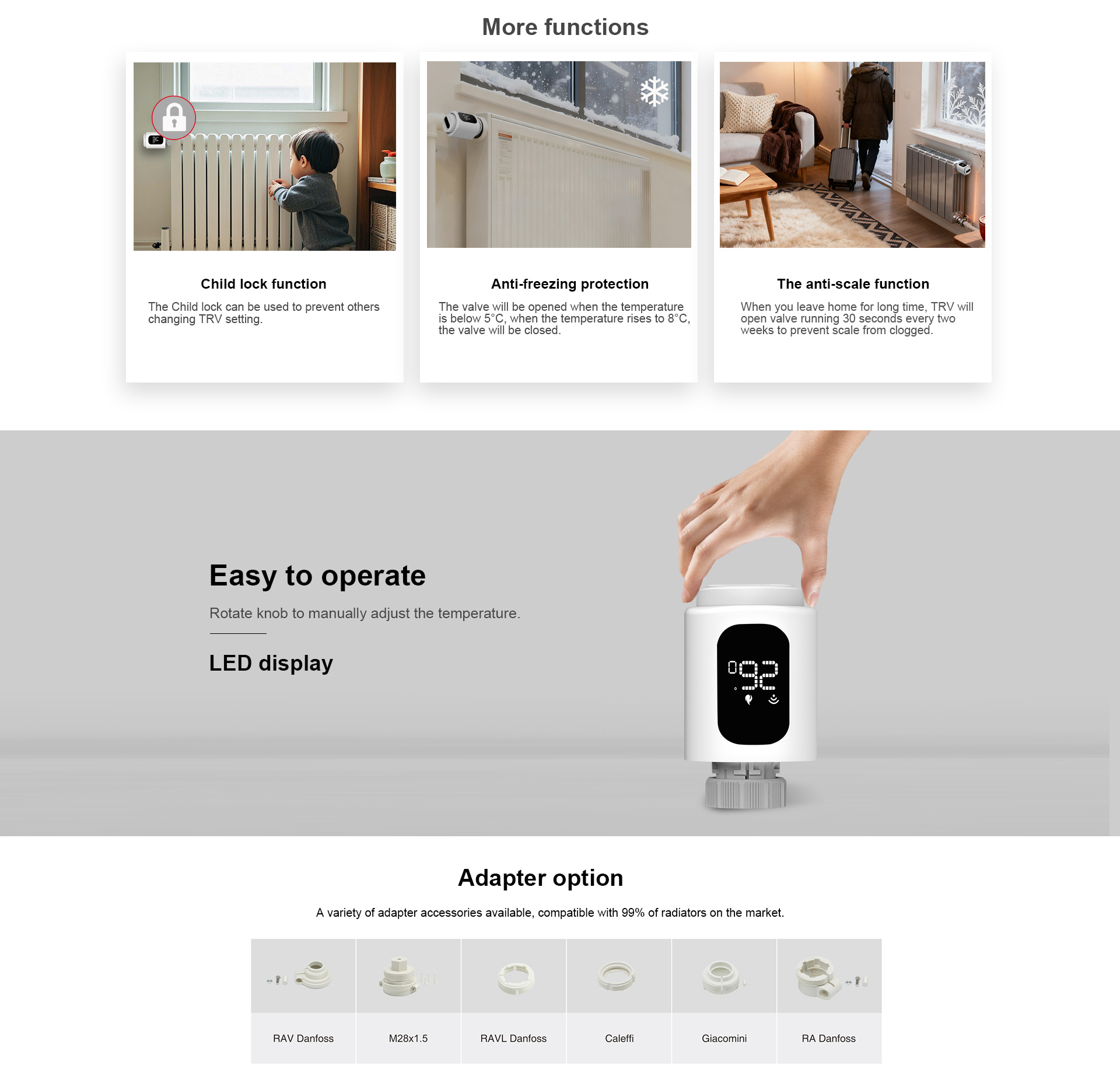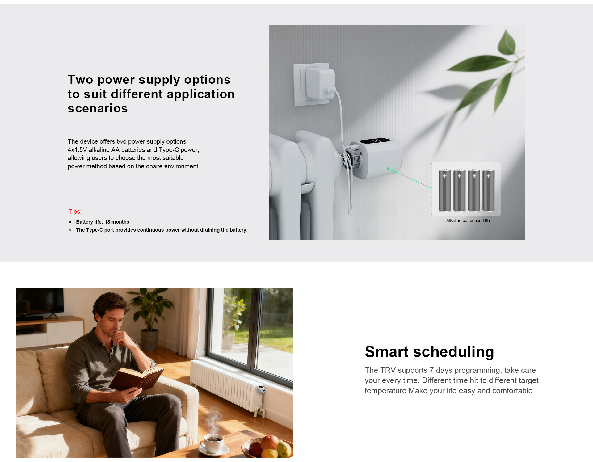 Es wird mit vier AA-Batterien mit einer Lebensdauer von 18 Monaten betrieben und ist mit 99 % aller Heizkörperventile kompatibel.